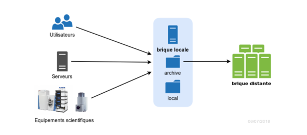 Les données sont déposées via SFTP (i.e. connexion chiffrée) sur la brique locale par les utilisateurs locaux ou par des machines (serveurs, équipements de laboratoires).