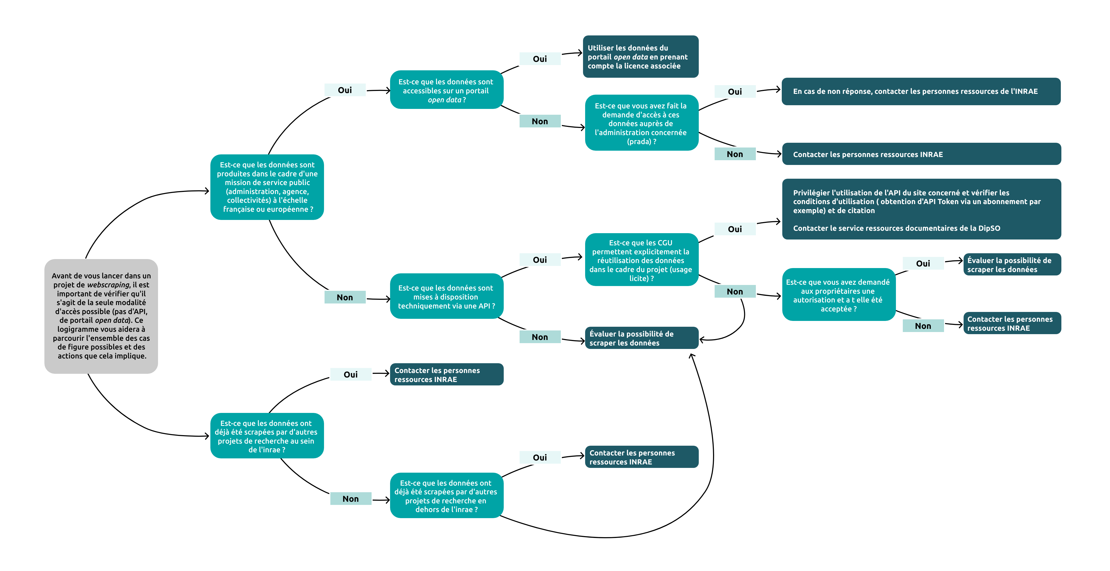 Dès le début d'un projet employant le webscraping, il est important de considérer l'ensemble des étapes du cycle de vie des données collectées pour anticiper au mieux les difficultés et blocages potentiels. Ce document vise à aider les porteurs et porteuses de projet utilisant cette méthode au sein d’INRAE à faire des choix éclairés tout au long du projet pour respecter l'ensemble des règles législatives et institutionnelles. Par le biais de checklists, de logigrammes et de recommandations, les porteurs et porteuses de projet seront capables d’anticiper au mieux chaque étape du webscraping. Ce document s'articule avec les autres documentations mises à disposition par INRAE (Gouvernance des Données, RGPD, Cybersécurité, etc.) et propose aussi une liste de ressources et de personnes soutiens au projet.